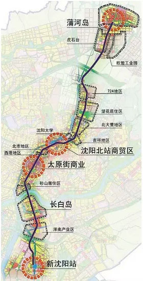 沿線(xiàn)貫穿了沈陽(yáng)北站、沈陽(yáng)南站等重要公共交通樞紐,沈陽(yáng)北站片區(qū)、太原街等金融商貿(mào)區(qū),砂山、望花、虎石臺(tái)、蒲河島等居住區(qū),以及沈陽(yáng)大學(xué)、渾南產(chǎn)業(yè)區(qū)、歐盟工業(yè)區(qū)等科教、產(chǎn)業(yè)區(qū)。