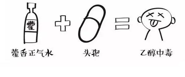 藿香正氣水中含有酒精,在體內(nèi)消化產(chǎn)生乙醇,而頭孢類藥物會(huì)抑制乙醇在體內(nèi)的代謝,造成乙醇蓄積,引起中毒,嚴(yán)重時(shí)可誘發(fā)急性肝損害、呼吸暫停甚至死亡。